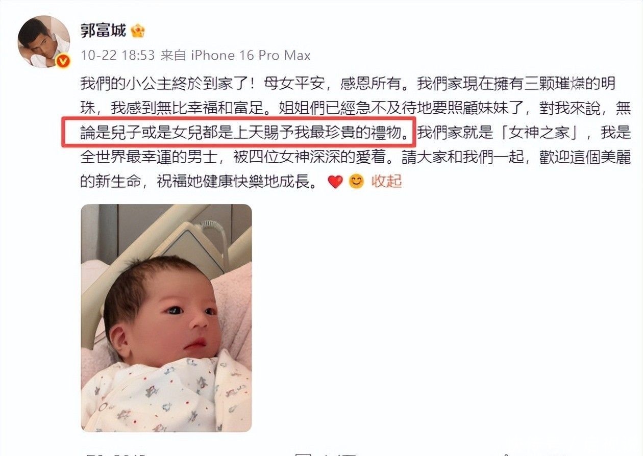 11. 郭富城在公布喜讯时写道:“无论是儿子还是女儿,都是上天赐予我最宝贵的礼物。”